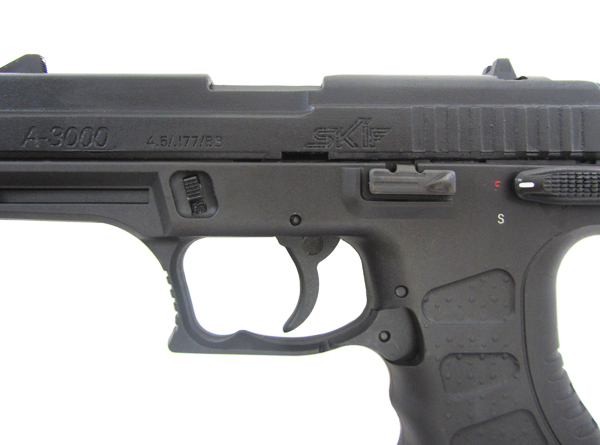 "Революционная" конструкция пистолета А-3000 "Скиф" впервые в истории пневматики использует конвейерный принцип работы магазина, в котором каждая пулька калибра 4,5 мм (.177) размещается в отдельном ролике. 28-зарядный магазин позволяет использовать "стальные шарики ВВ" и все виды свинцовых пуль длиной не более 7,6 мм в любом порядке заряжания. Подвижный ствол обеспечивает надежное уплотнение зазоров при выстреле. Серию А-3000 отличает насыщенность новыми техническими решениями: рычажная система прокола баллона, подвижная затворная рама, затворная задержка, удобный флажковый предохранитель, нерегулируемая прицельная планка, возможность постановки курка на предварительный взвод.Калибр, мм