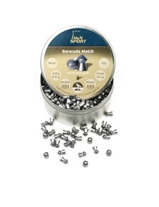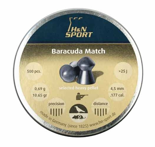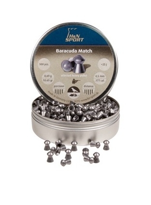 Пуля пневм. H&N Baracuda Match .177" 4,5 mm -headsize 4,53 (вес 0,69). Тяжелая, высокоточная пуля для дальних дистанций. Первоклассный аэродинамический дизайн для высокой пробиваемости и проникающей способности. Очень высокая кучность. Минимальное освинцовывание и равномерное распределение попаданий благодаря специальному сплаву и смазке. Специальная сортировка. Имеющиеся диаметры головной части: 4,50–4,53 и 5,51–5,53. Поверхность гладкая.